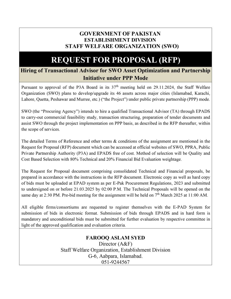 Hiring of Transactional Advisor for SWO Asset Optimization and Partnership Initiative under PPP Mode
