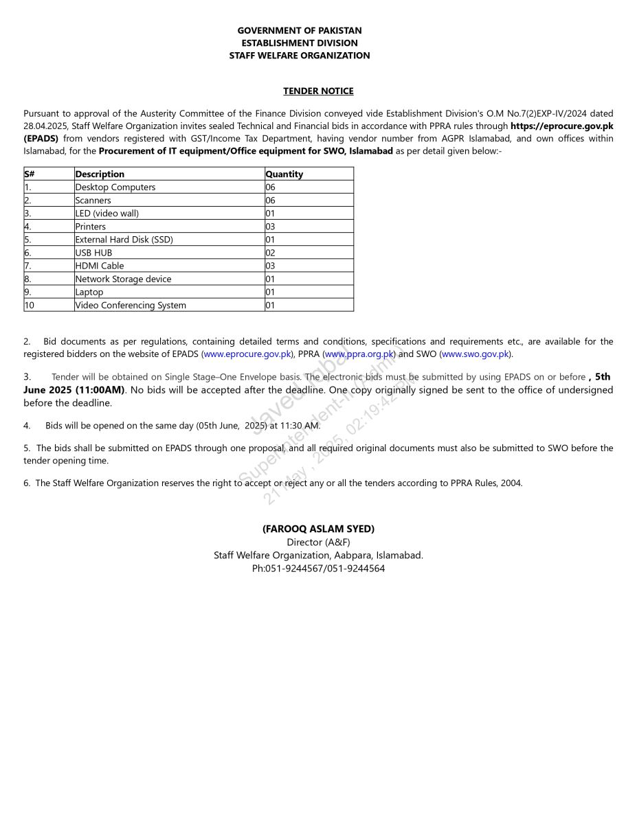 Click here to download Tender for the purchase ot IT Equipment for SWO, HQs, Islamabad